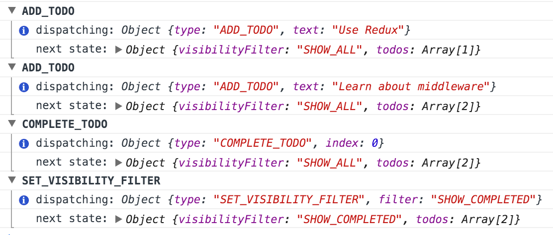 Now middleware takes the next() dispatch function, and returns a dispatch function, which in turn serves as next() to the middleware to the left, and so on. It's still useful to have access to some store methods like getState(), so store stays available as the top-level argument.