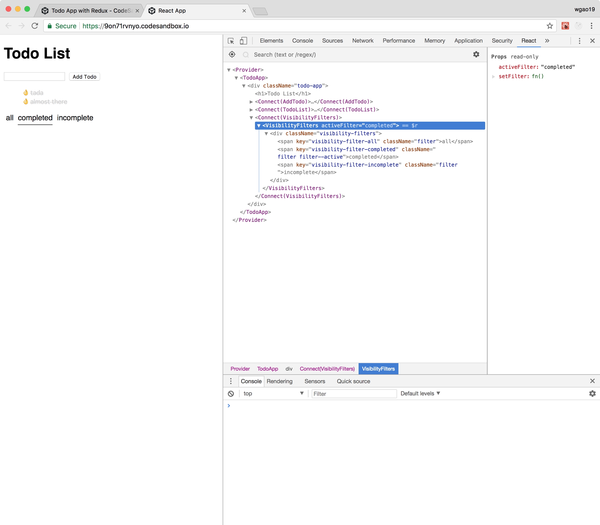 function call was simply the selector that selects the whole list of todos. Let’s write another selector to help filtering todos by their status.